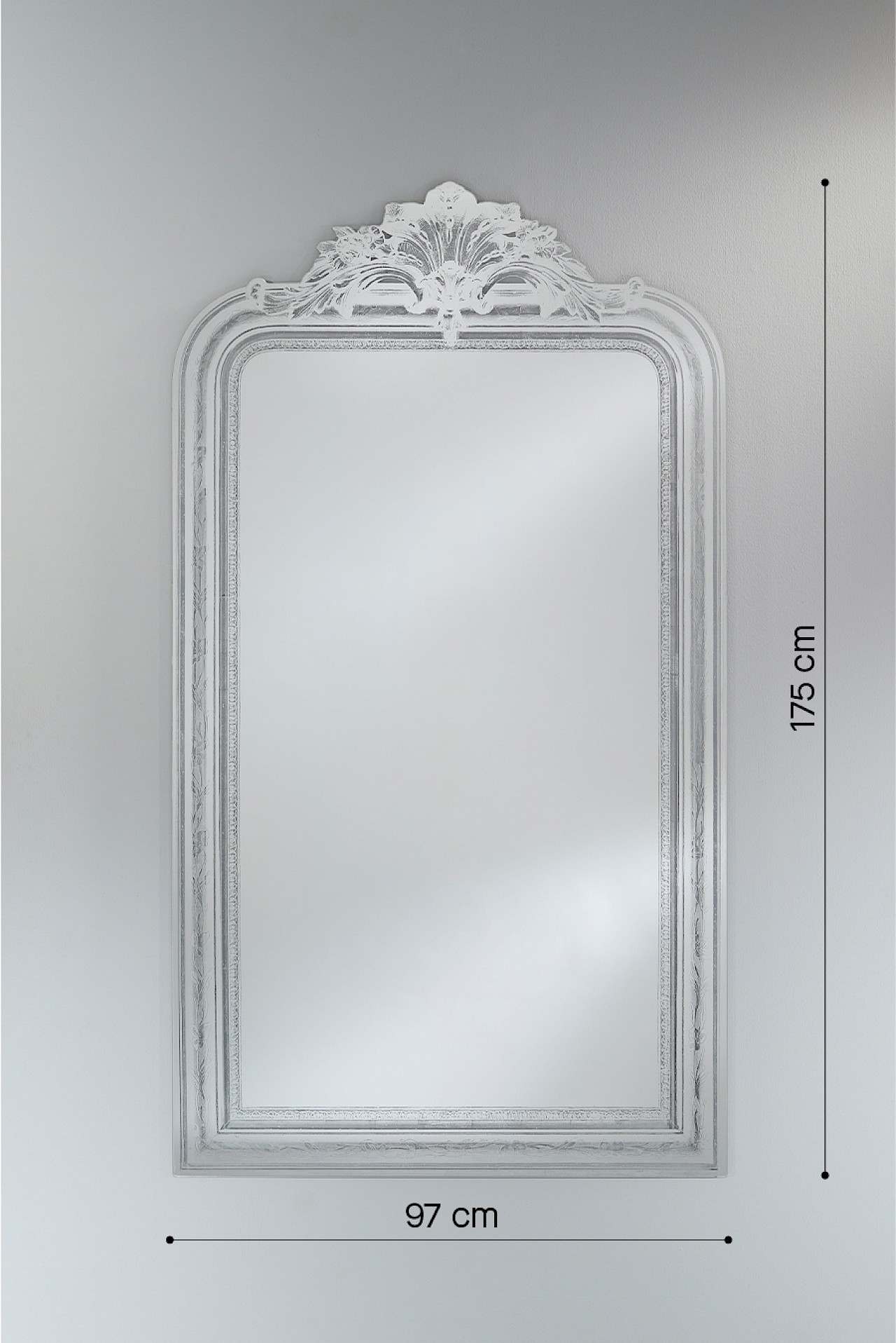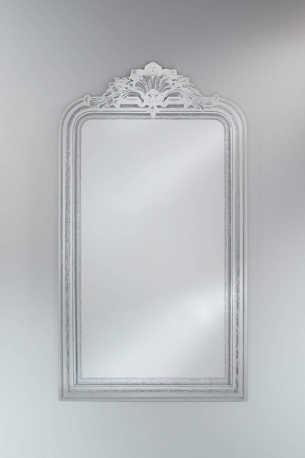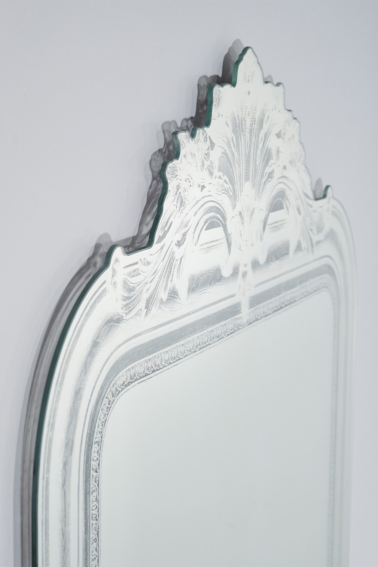Ce design s’inspire d’un miroir haussmannien du XIXe siècle, réinterprété sous forme de silhouette en deux dimensions. Grâce aux techniques modernes, sa forme complexe a été traduite en une composition superposée de transparence et d’argenture. Le résultat est un miroir saisissant qui capture l’essence de l’original tout en s’inscrivant pleinement dans le présent.