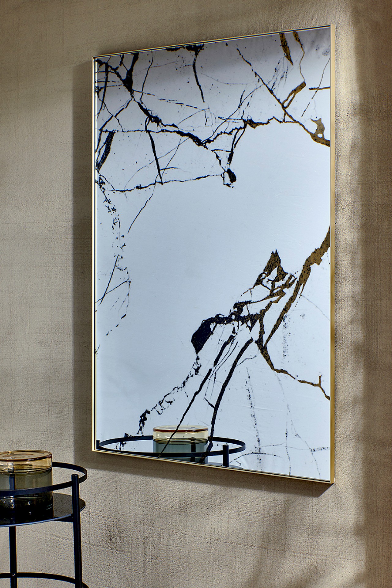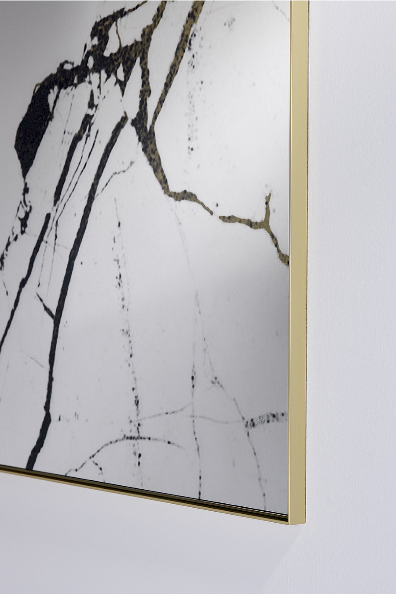 Les veines noires avec une nuance de bronze brillant donnent vie au miroir. Le cadre fin de couleur dorée mat qui entoure le miroir confère à la composition une finition de grande classe.