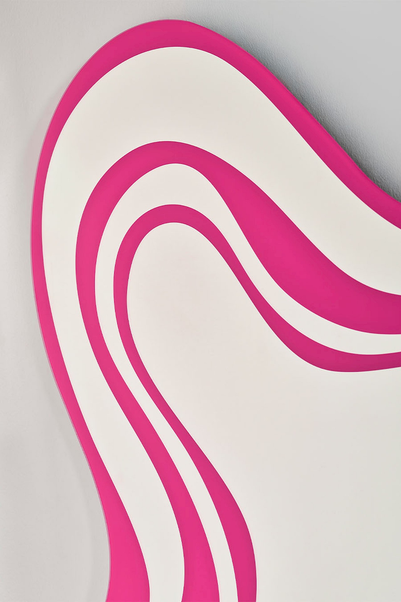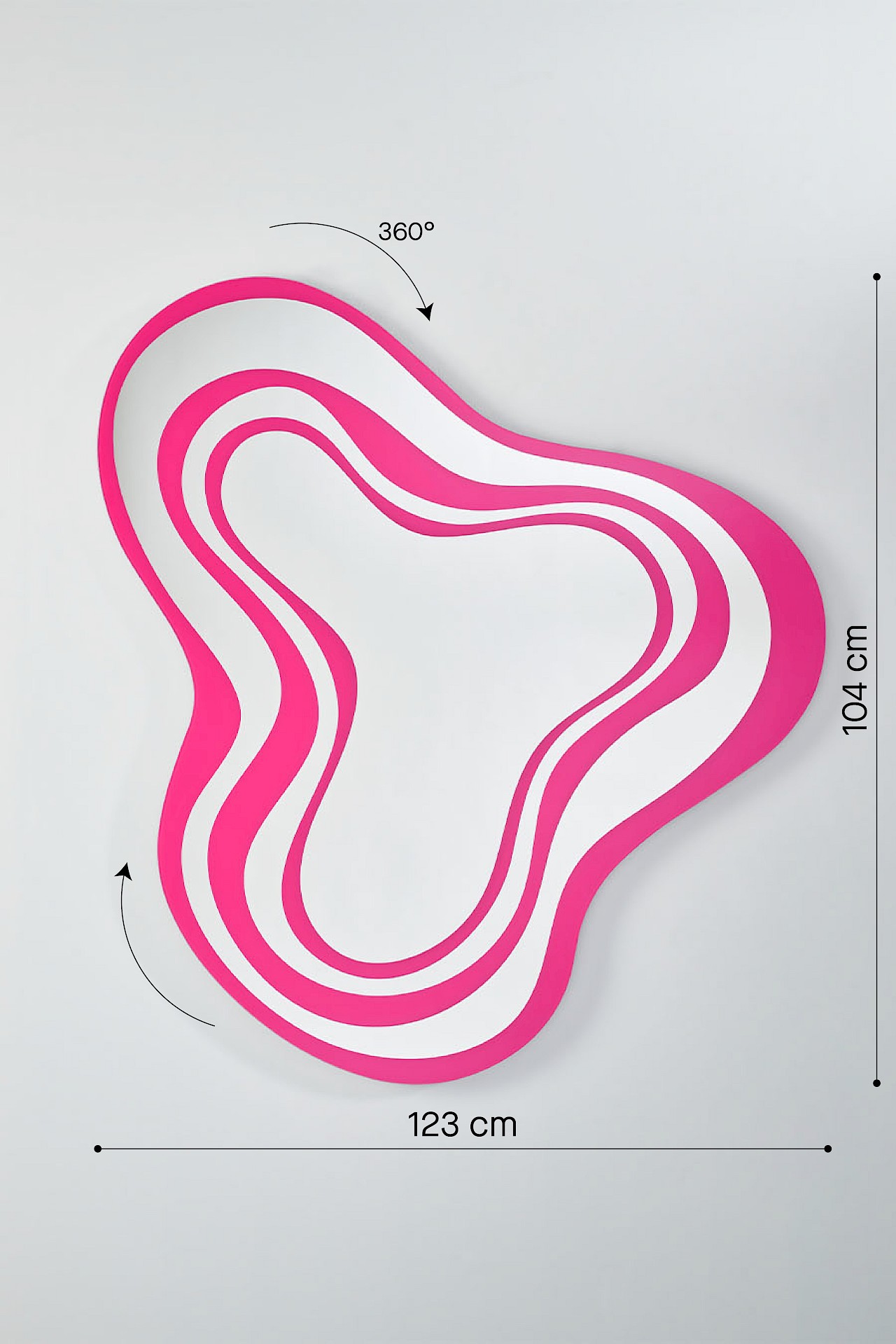 Inspiré par la beauté éphémère des nuages et leur mouvement constant, NIMBUS PINK est une fusion poétique de forme et de fonction. Les alternances de bandes argentées et colorées évoquent la fluidité des nuages flottants, produisant un effet visuel rythmique et presque méditatif. Nimbus apporte une touche de surréalisme à l’espace, idéal pour un couloir, une salle de bain ou tout intérieur cherchant fluidité et optimisme.