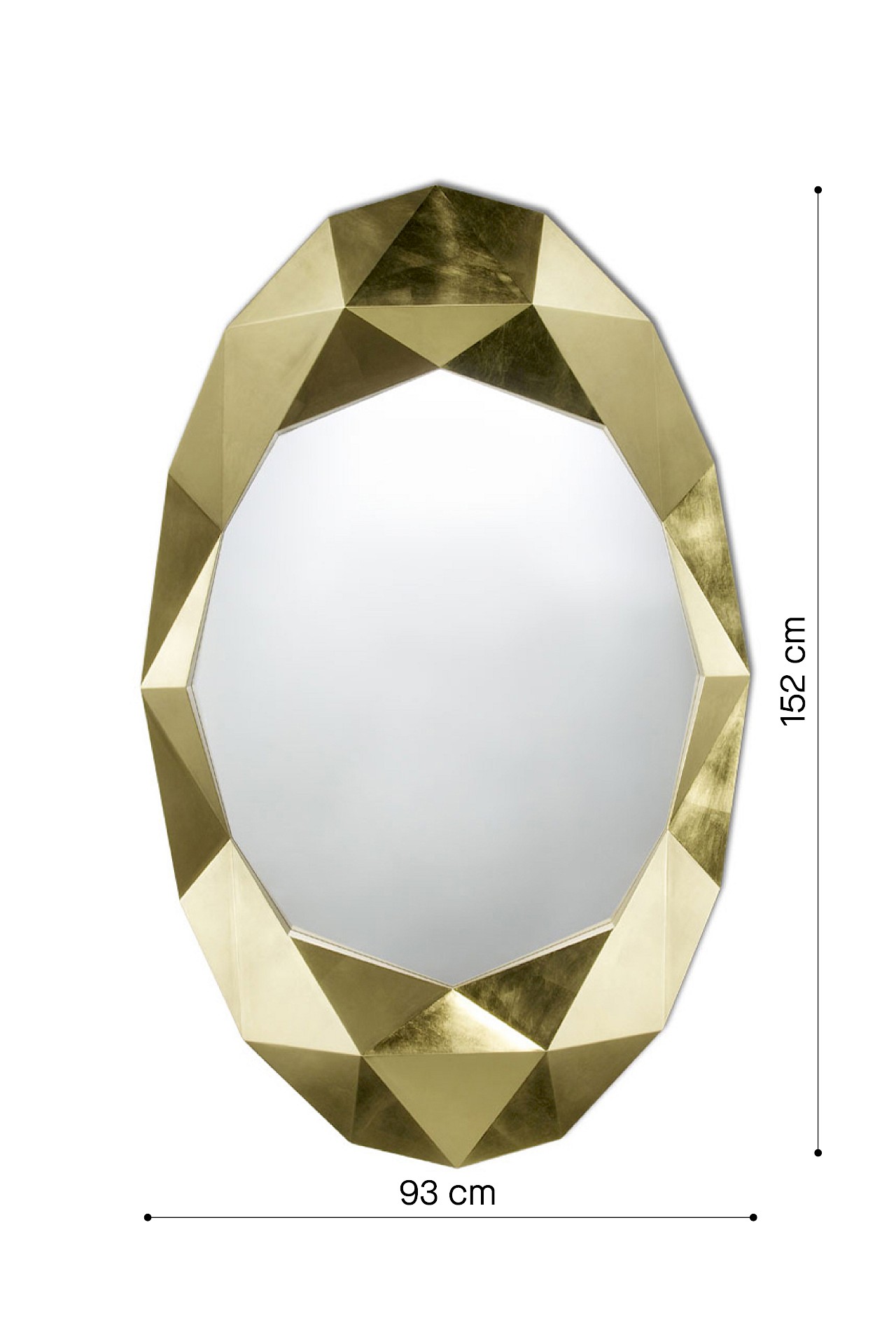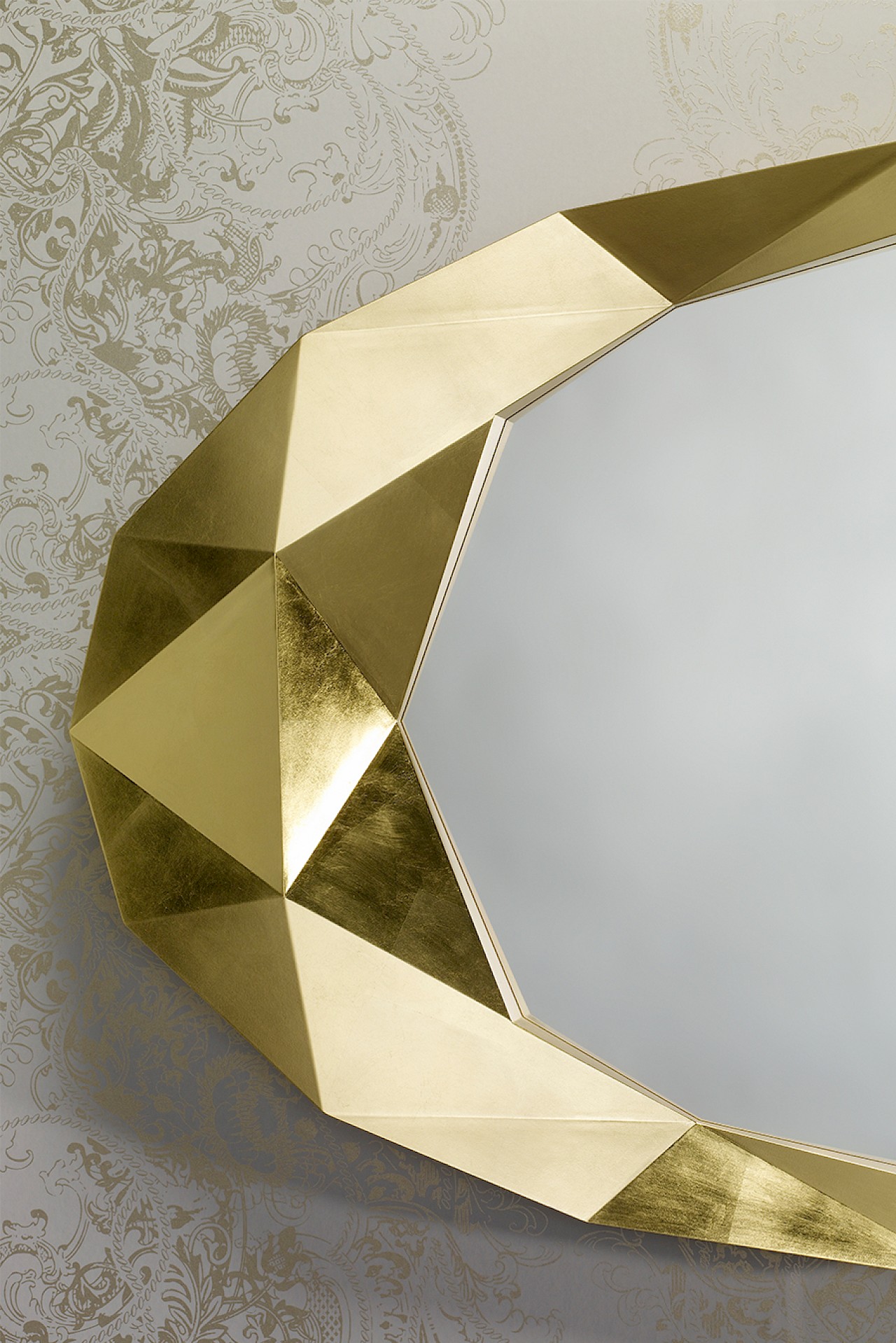 La structure de ce cadre fait briller et scintiller le miroir comme une véritable pierre précieuse. Le reflet de la lumière sur les surfaces mates et inclinées crée des ombres qui accentuent le dessin du cadre. Le PRECIOUS GOLD est moderne et très pur.