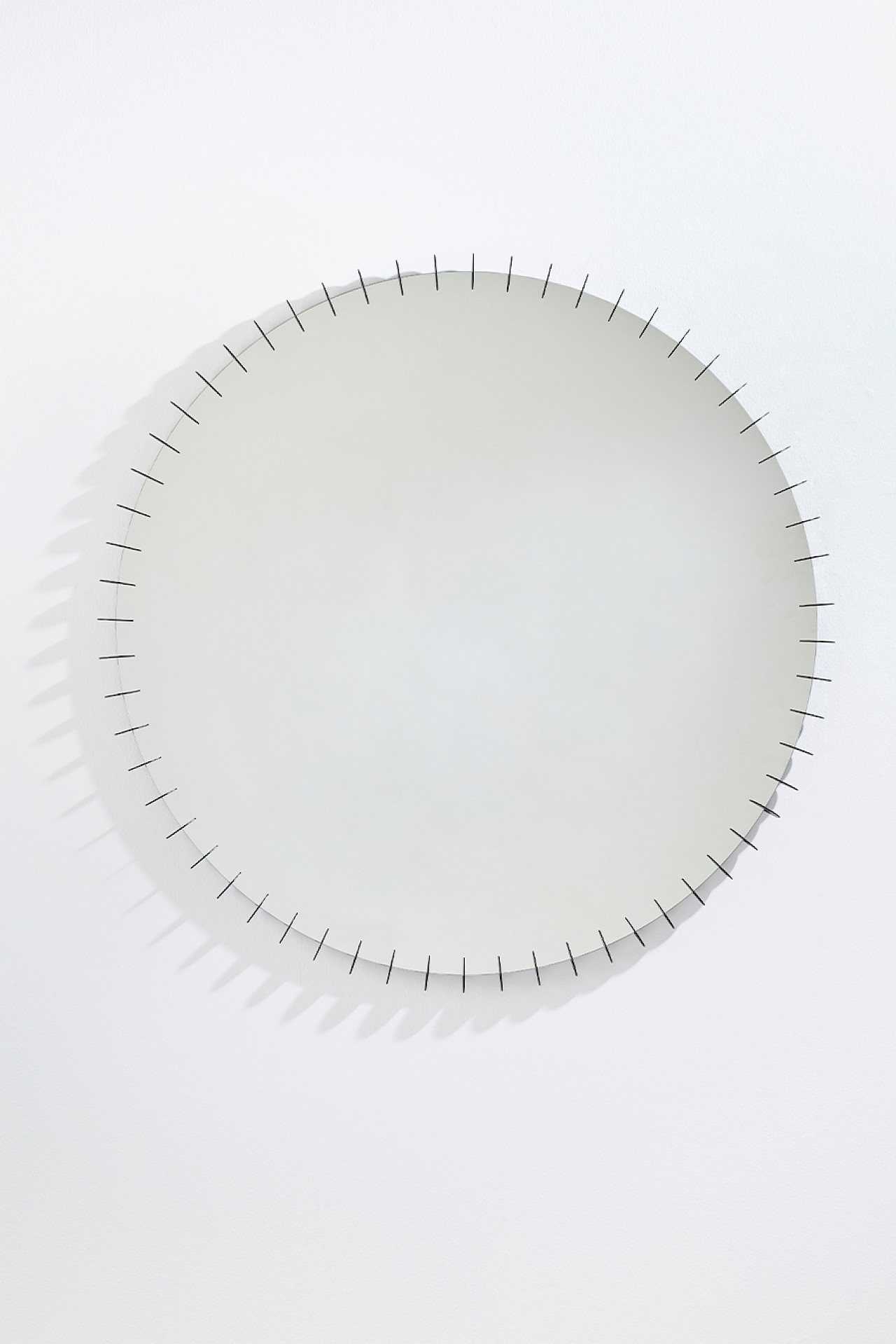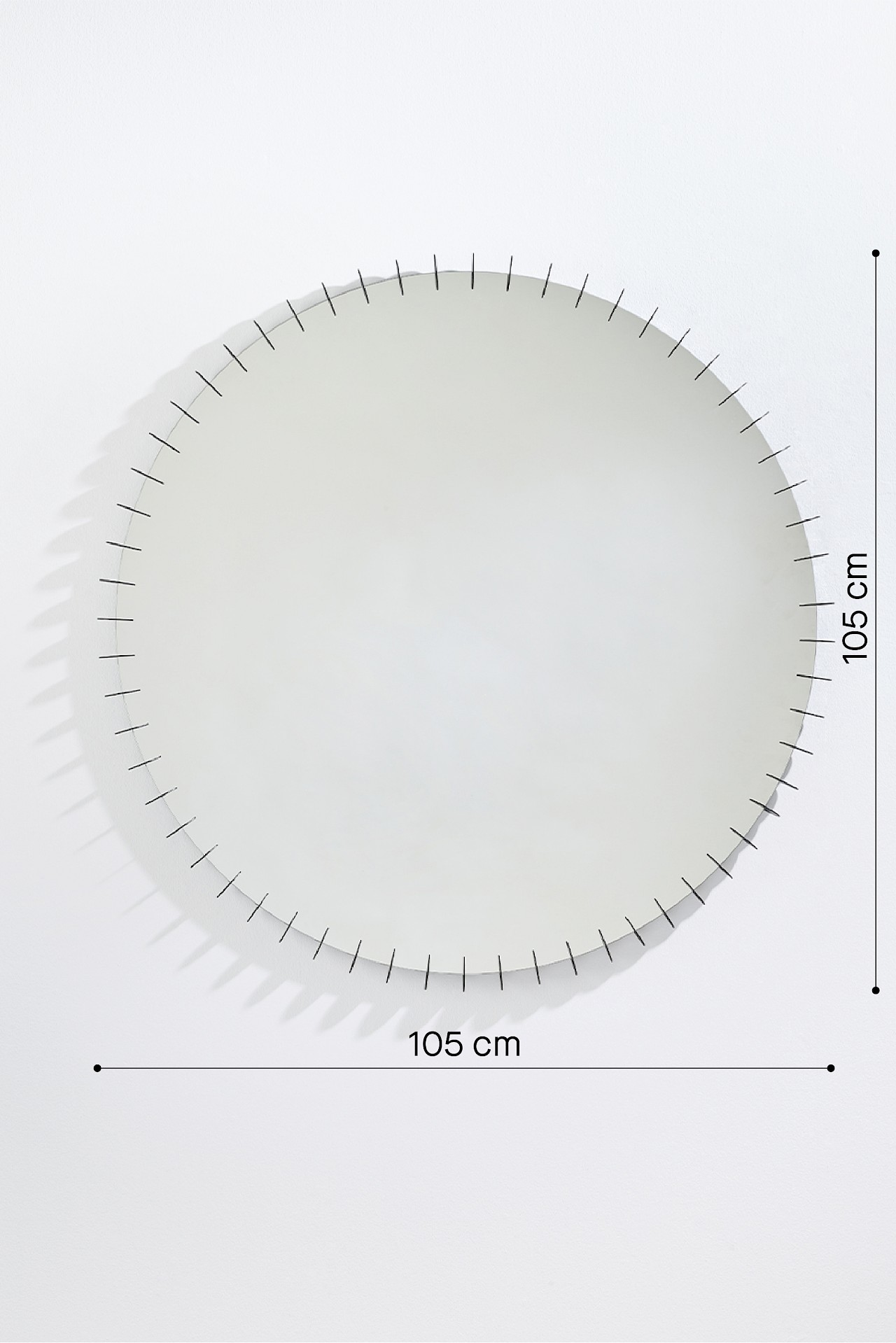 Pas moins de 60 cercles métalliques ornent le bord extérieur de RAY BLACK L. Liés à l’étonnant miroir rond d’un mètre de diamètre, les petits disques semblent se poursuivre dans le reflet, donnant à Ray un effet intrigant, une illusion de continuité sans faille.