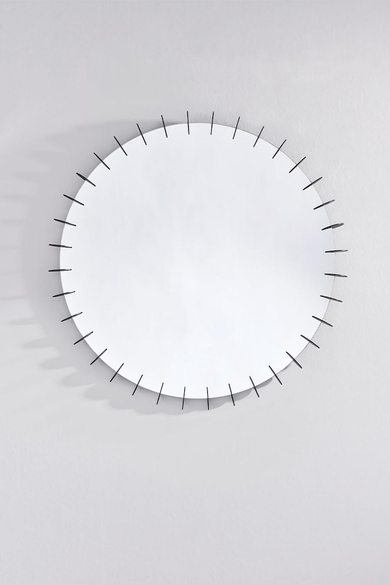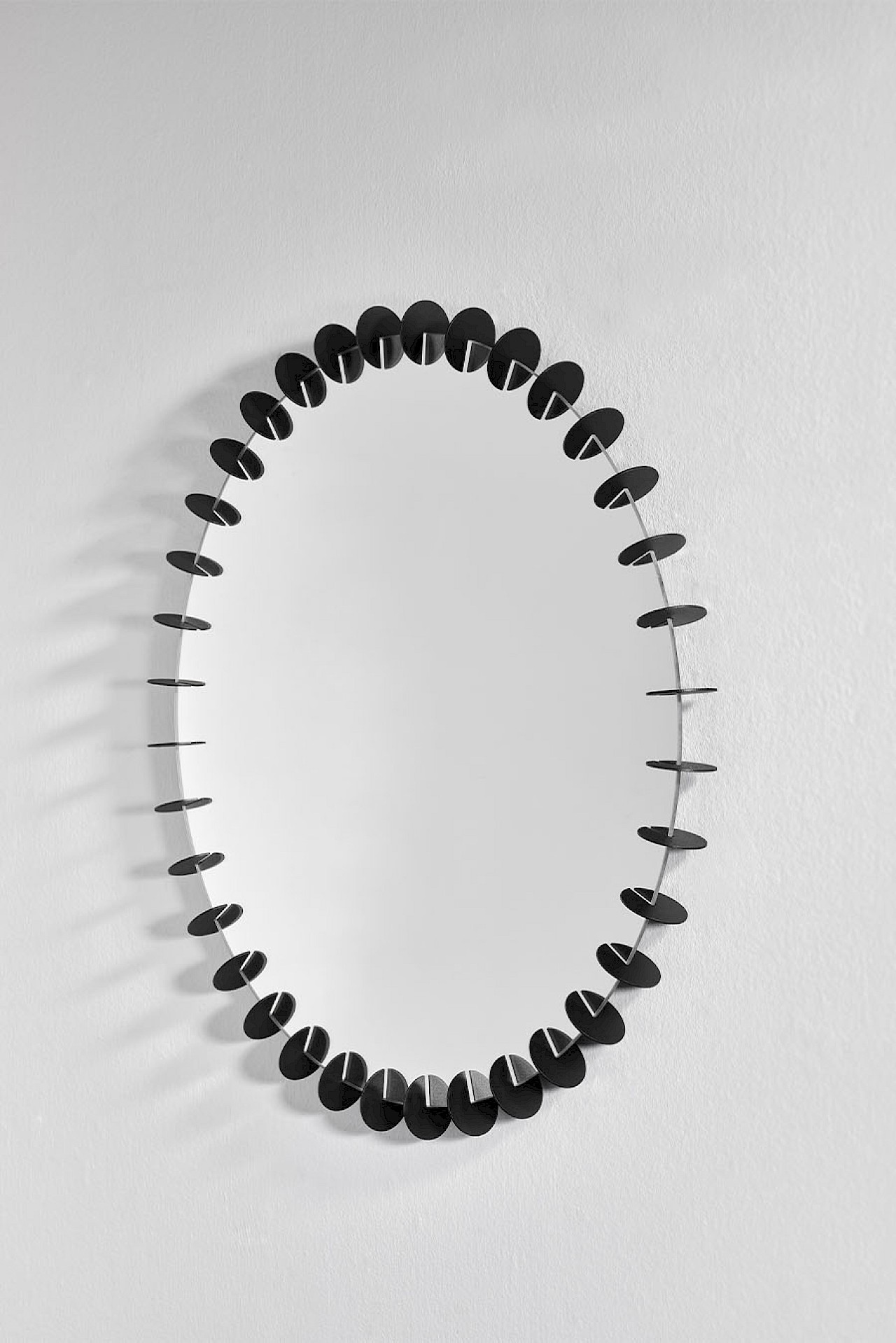 Une gamme infinie de cercles métalliques ornent le bord extérieur de RAY BLACK S. Liés au miroir rond magnifique de 65 cm de diamètre, les petits disques semblent se poursuivre dans le reflet, donnant à Ray un effet intrigant, une illusion de continuité sans faille.