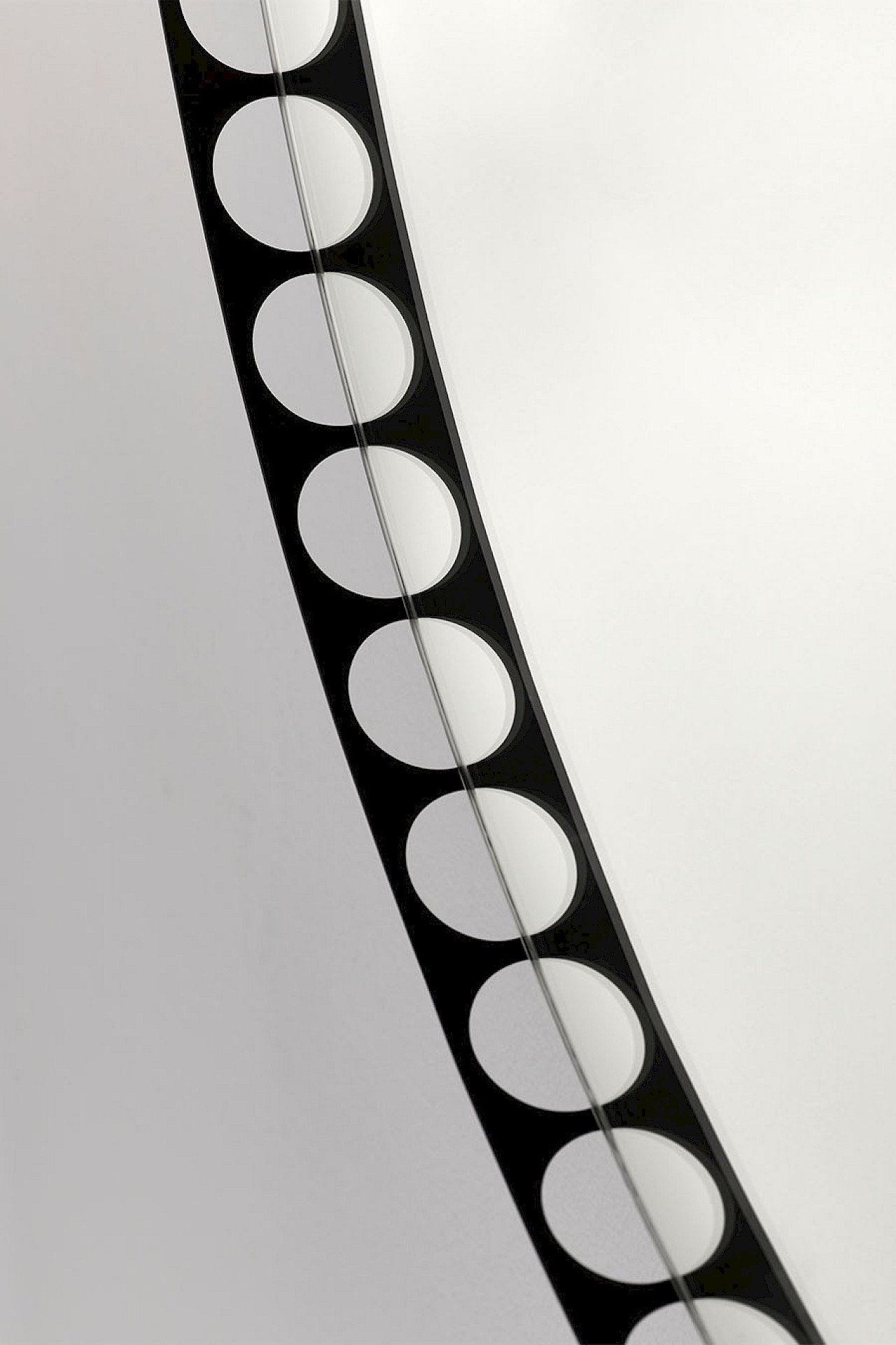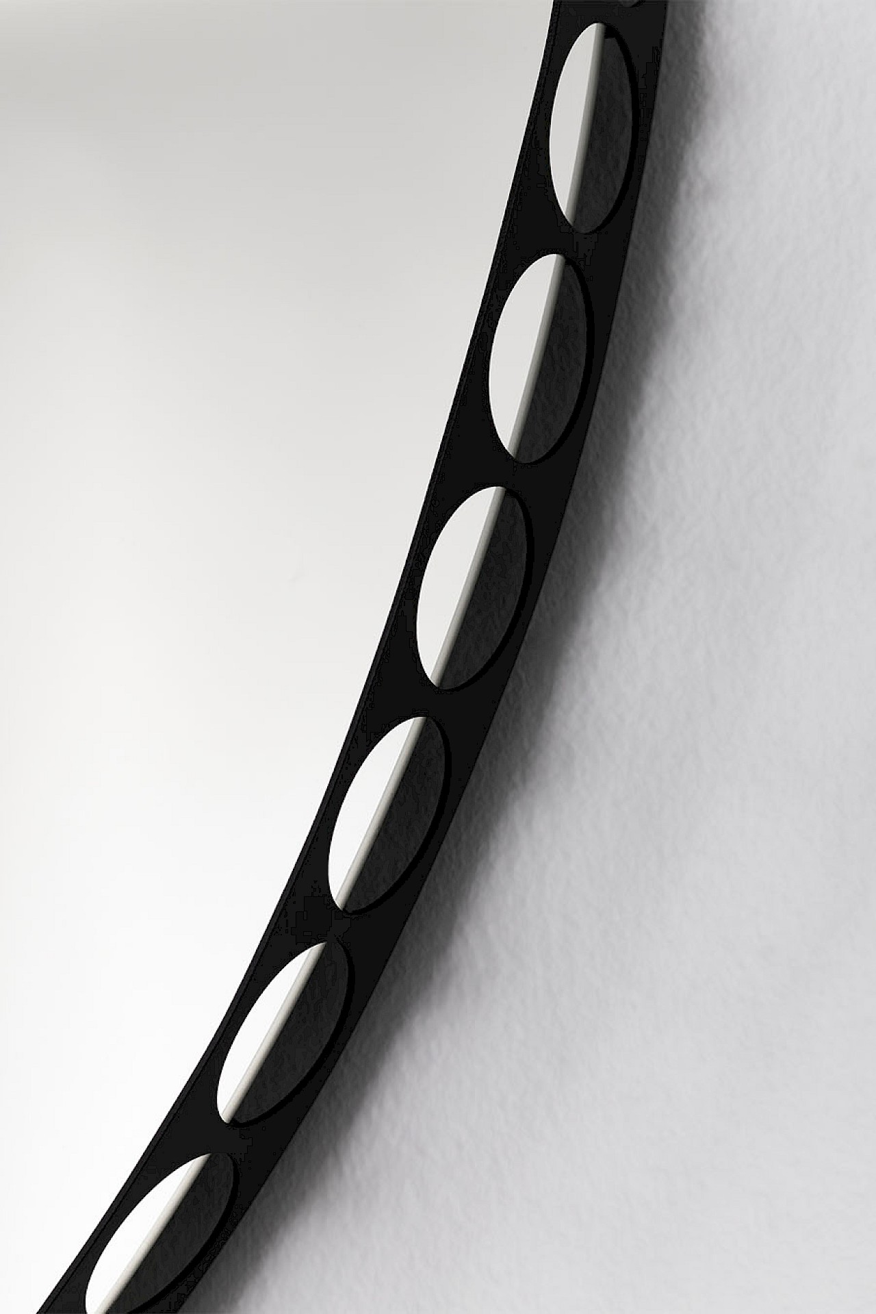 Ce miroir rond est doté d’un cadre en métal noir soigneusement conçu, fini avec un revêtement en poudre finement structuré. Les perforations circulaires du cadre se reflètent ingénieusement dans le miroir central, créant l’illusion de voir à travers le miroir. Les centres de ces ouvertures circulaires sont parfaitement alignés avec la surface réfléchissante, créant une illusion graphique qui fait apparaître mystérieusement les trous derrière et devant le miroir.