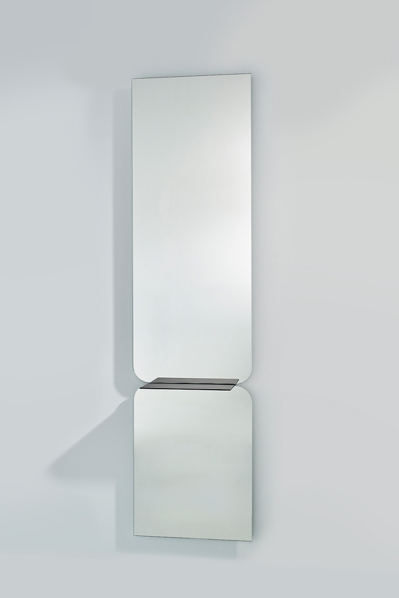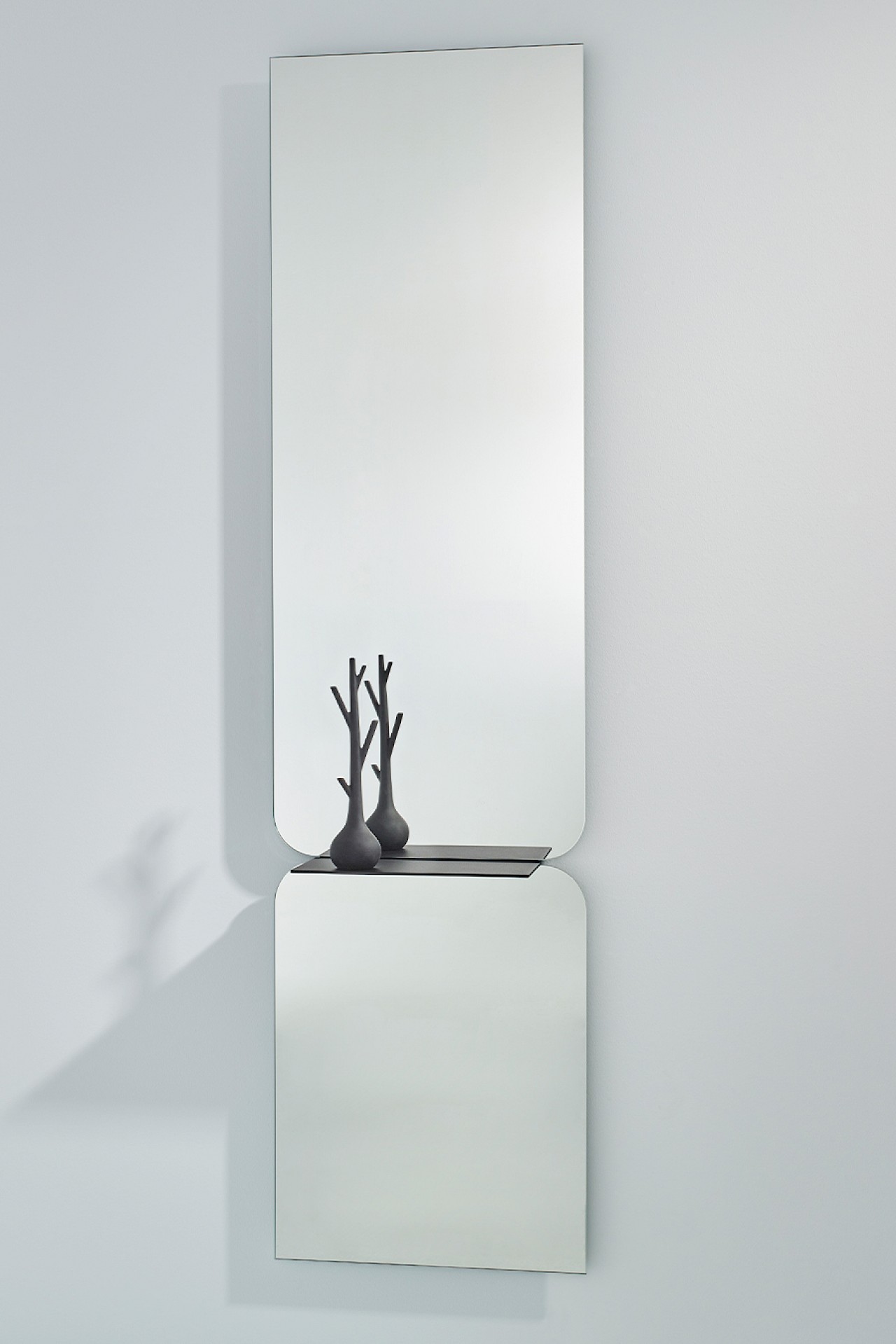 Un élégant miroir équipé d’une étagère en aluminium poudré.En recentrant par jeu d’optique le miroir, de la place est créée pour l’étagère de manière ludique et amusante. Vous pouvez y placer la déco adaptée pour personnaliser encore plus ce miroir et votre intérieur.