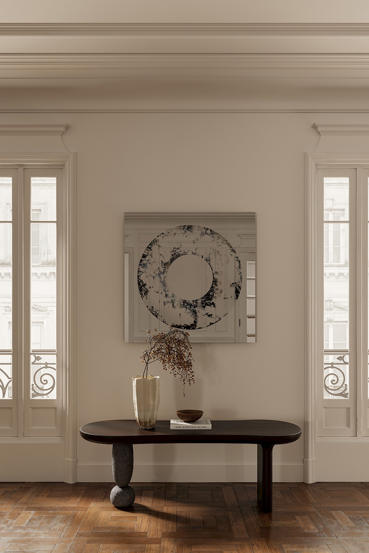 Un tore est une forme tridimensionnelle qui se forme lorsqu’un cercle tourne autour de son propre axe. Ce qui rend ce miroir unique, c’est que le « tore » est argenté manuellement et produit donc des motifs uniques à chaque fois. De cette façon, ce miroir met plus que jamais en valeur le savoir-faire de nos « Master mirror makers ».
