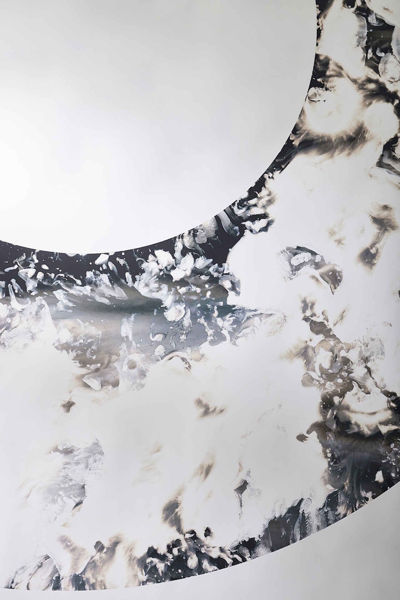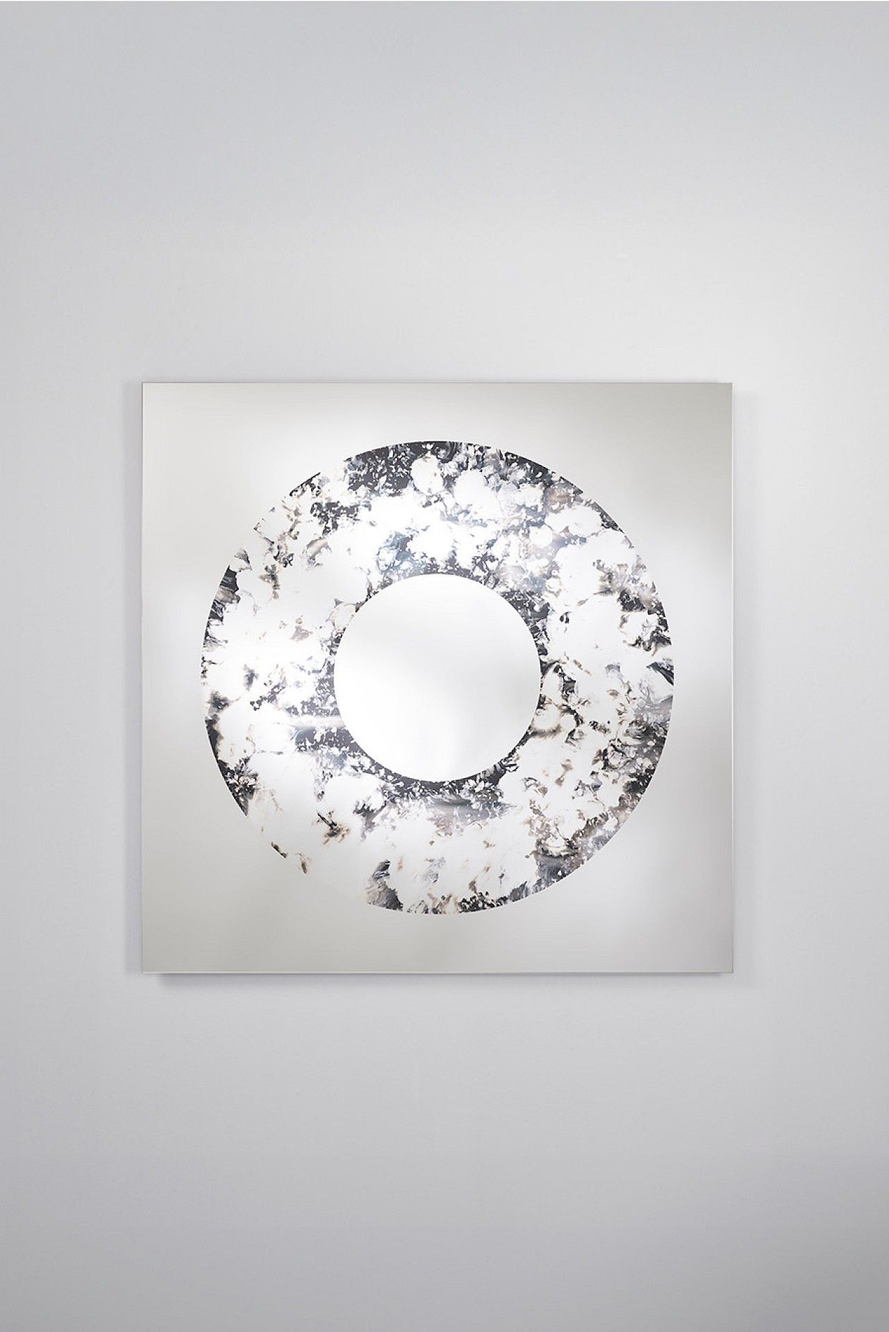 Les motifs organiques du tore et la projection d’argent à la main créent un contraste saisissant avec le reste du miroir, qui est parfaitement argenté et poli industriellement. Le processus de coulage manuel crée des motifs complexes en noir, gris, argent et brun, semblables aux formes imprévisibles des nuages. En conséquence, chacun découvre encore et encore des dessins différents et expressifs, ce qui rend chaque miroir unique.
