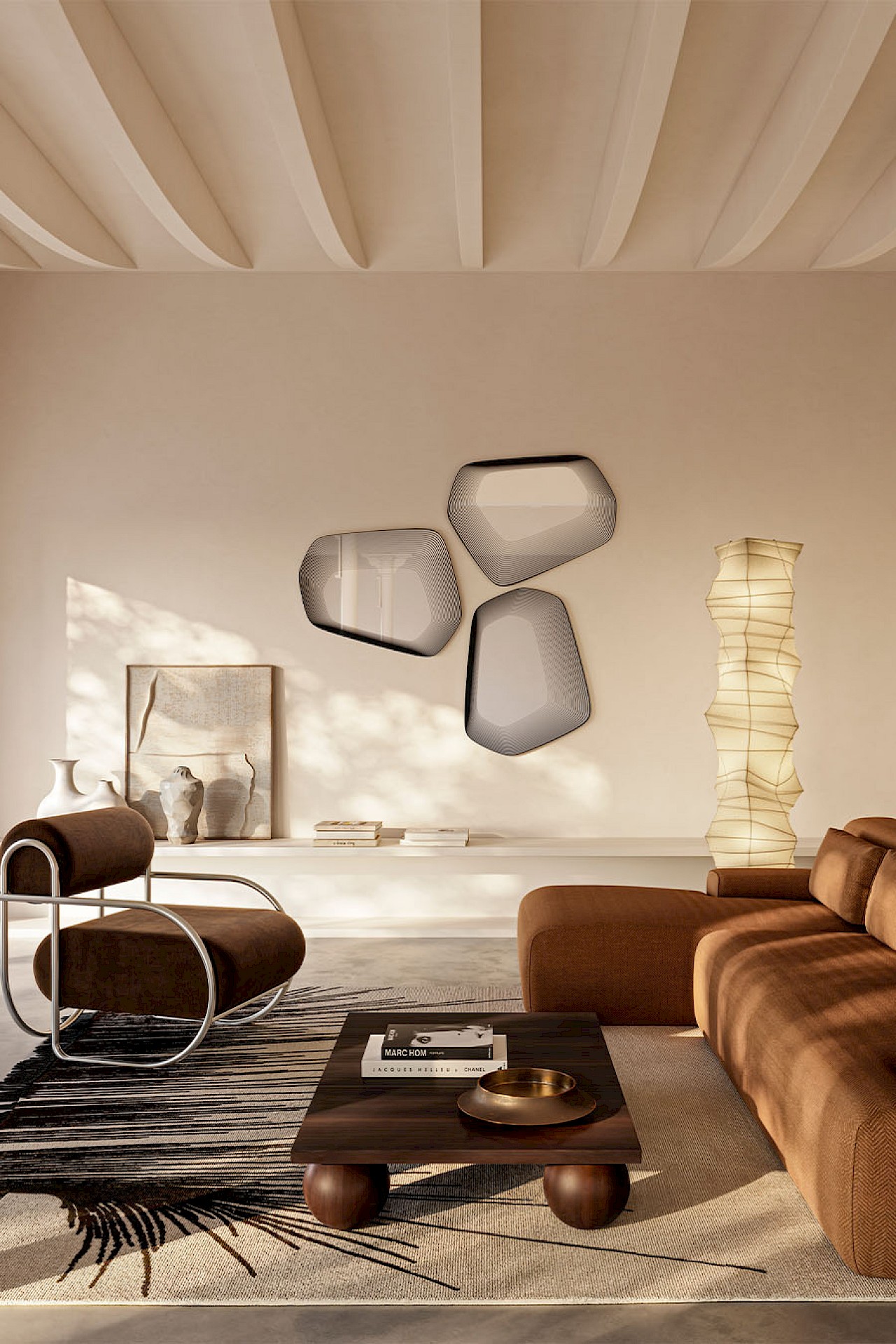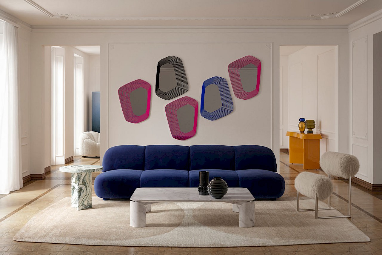 Connu pour son usage vibrant de la couleur et ses lignes fluides, Karim s’inspire du langage expressif des années 60 pour créer un miroir à la fois nostalgique et moderne. Le contour irrégulier est souligné par une série de lignes en retrait, créant un rythme visuel et une profondeur surprenante. Vibe apporte une touche de couleur et de personnalité à chaque espace. Son format compact le rend idéal pour les petites pièces comme les toilettes ou un couloir. Il se prête aussi aux compositions creatives, parfait en ensemble ludique ou en pièce unique d’expression design.