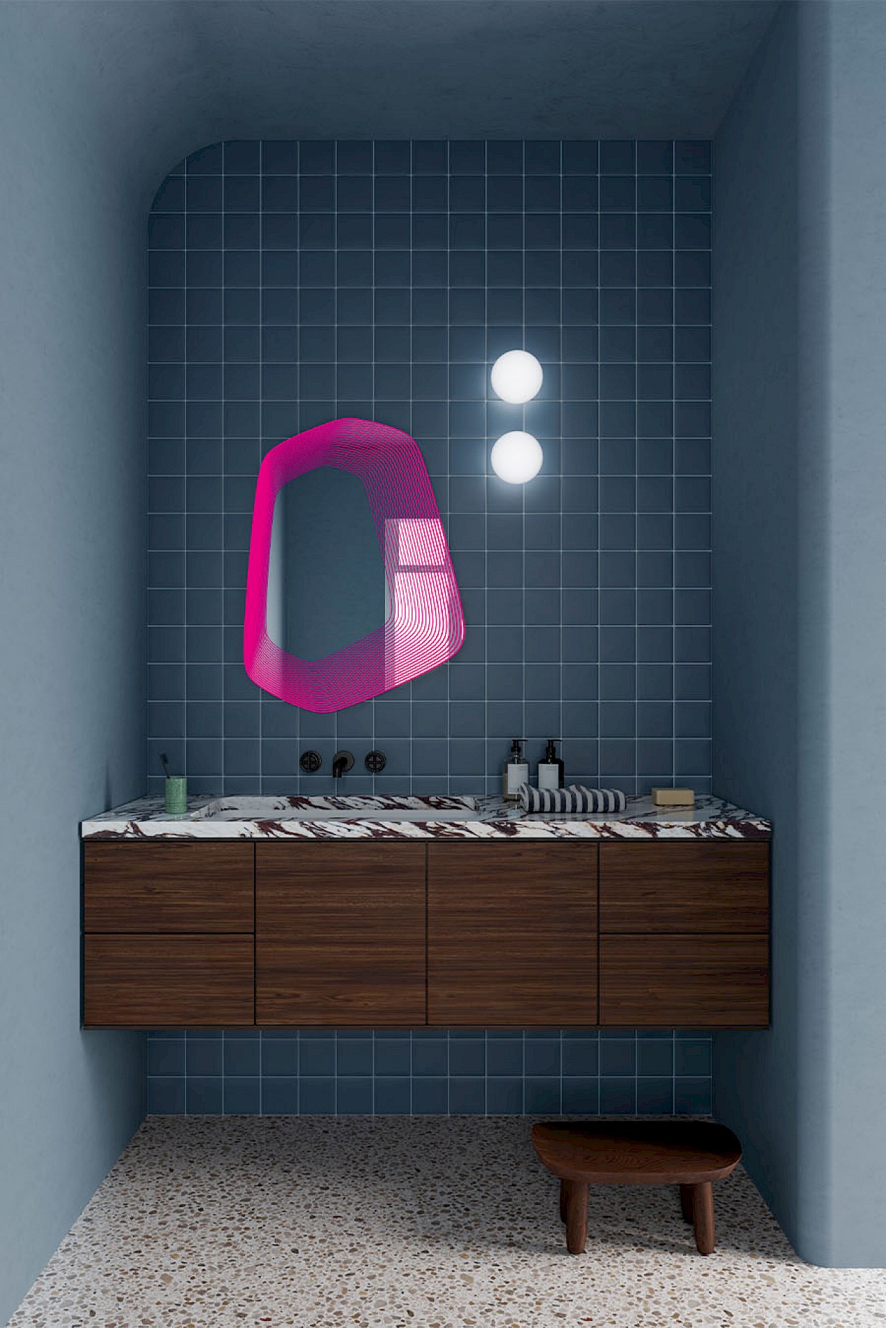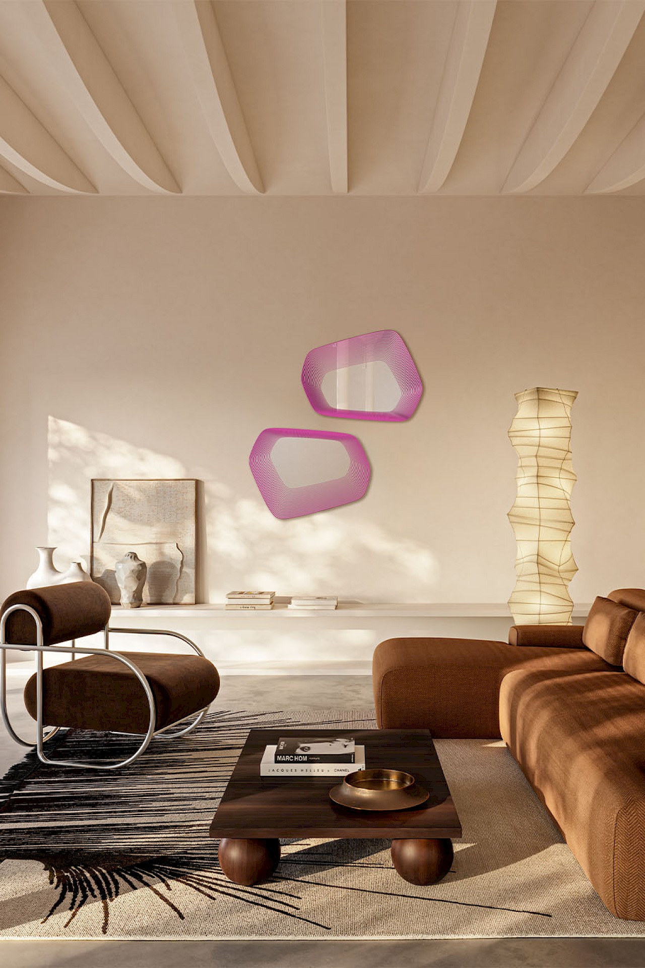 Connu pour son usage vibrant de la couleur et ses lignes fluides, Karim s’inspire du langage expressif des années 60 pour créer un miroir à la fois nostalgique et moderne. Le contour irrégulier est souligné par une série de lignes en retrait, créant un rythme visuel et une profondeur surprenante. Vibe apporte une touche de couleur et de personnalité à chaque espace. Son format compact le rend idéal pour les petites pièces comme les toilettes ou un couloir. Il se prête aussi aux compositions creatives, parfait en ensemble ludique ou en pièce unique d’expression design.
