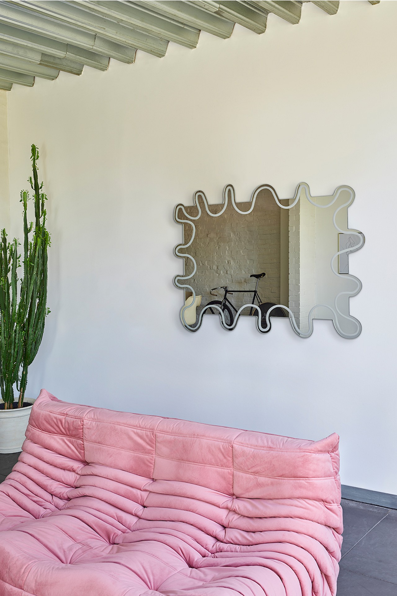Un miroir qui semble bouger – « wiggle » en anglais – mais qui ne le fait évidemment pas. WIGGLE est rétro, ludique et à la fois élégant et mystérieux. Sa ligne sinueuse mate gravée encadrant le miroir lui donne un reflet intrigant. Wiggle peut être suspendu dans 4 directions.